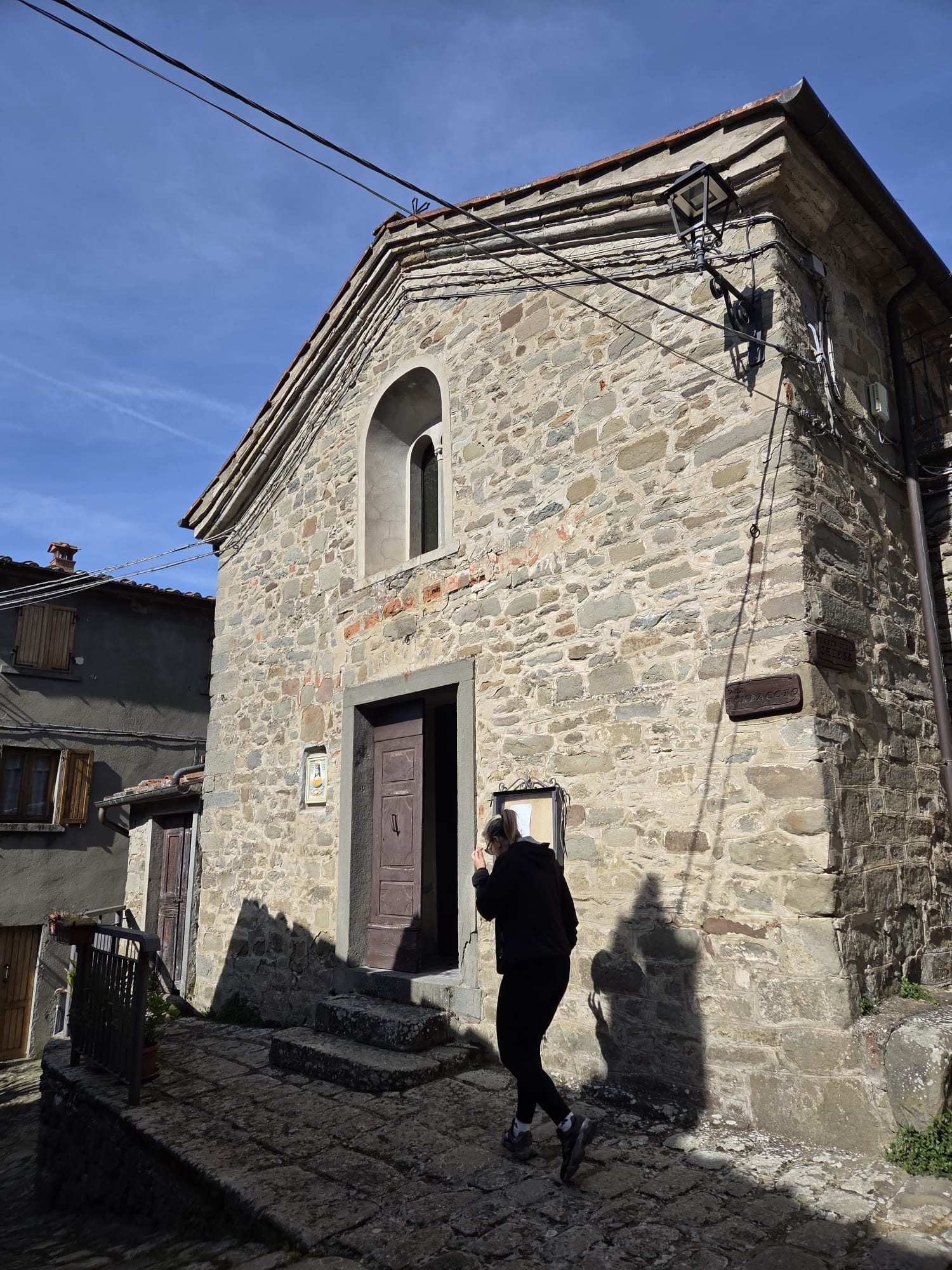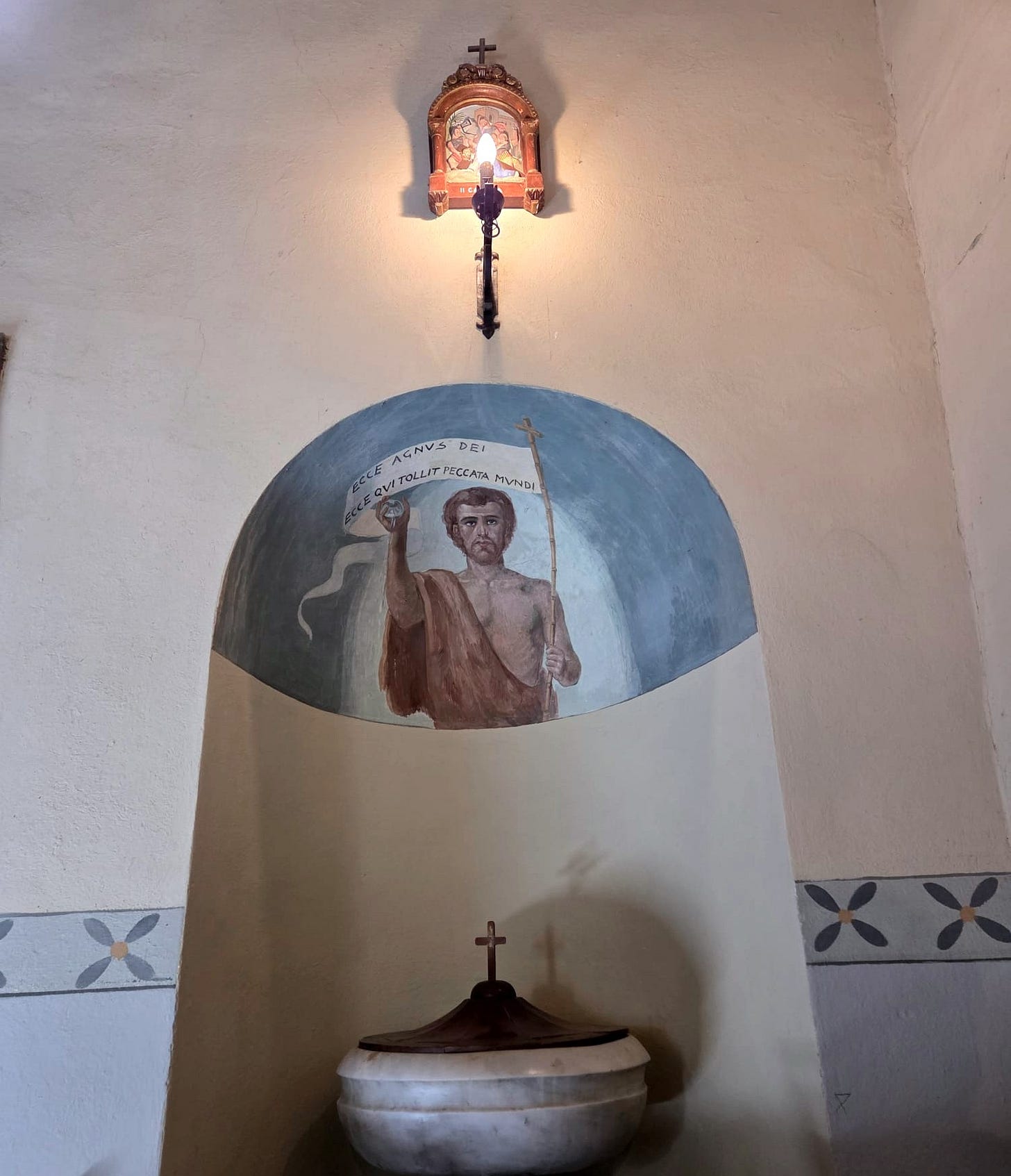 We parked and walked over the bridge and up the hill to the church. At the back was a huge fresco behind the altar of San Clemente himself, we guessed. In true Italian style, mass started late, but I was surprised to see thirty to forty people there, including one very loud baby that made everyone smile even though it was fussy and hungry. In a country that has plummeted to a negative birthrate, when just a century ago families of six to ten children were not unusual, it was clear that the Italian toddler was an Easter miracle worthy of his own celebration. There were people of all ages in the pews, not just grandparents, but plenty of people who looked over eighty and ninety as well.